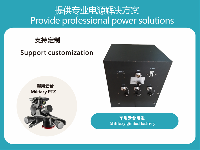 Special lithium battery for military pan/tilt, spin force adopts lithium iron phosphate 24V lithium battery solution, three-way voltage stabilization output, remote data transmission, meeting the working needs of different electronic equipment, safety, cycle life of more than 2000 times. Separate charging and discharging, power display, a single switch controls the output and input of the entire battery, and it is easy to control by intelligent manual labor.